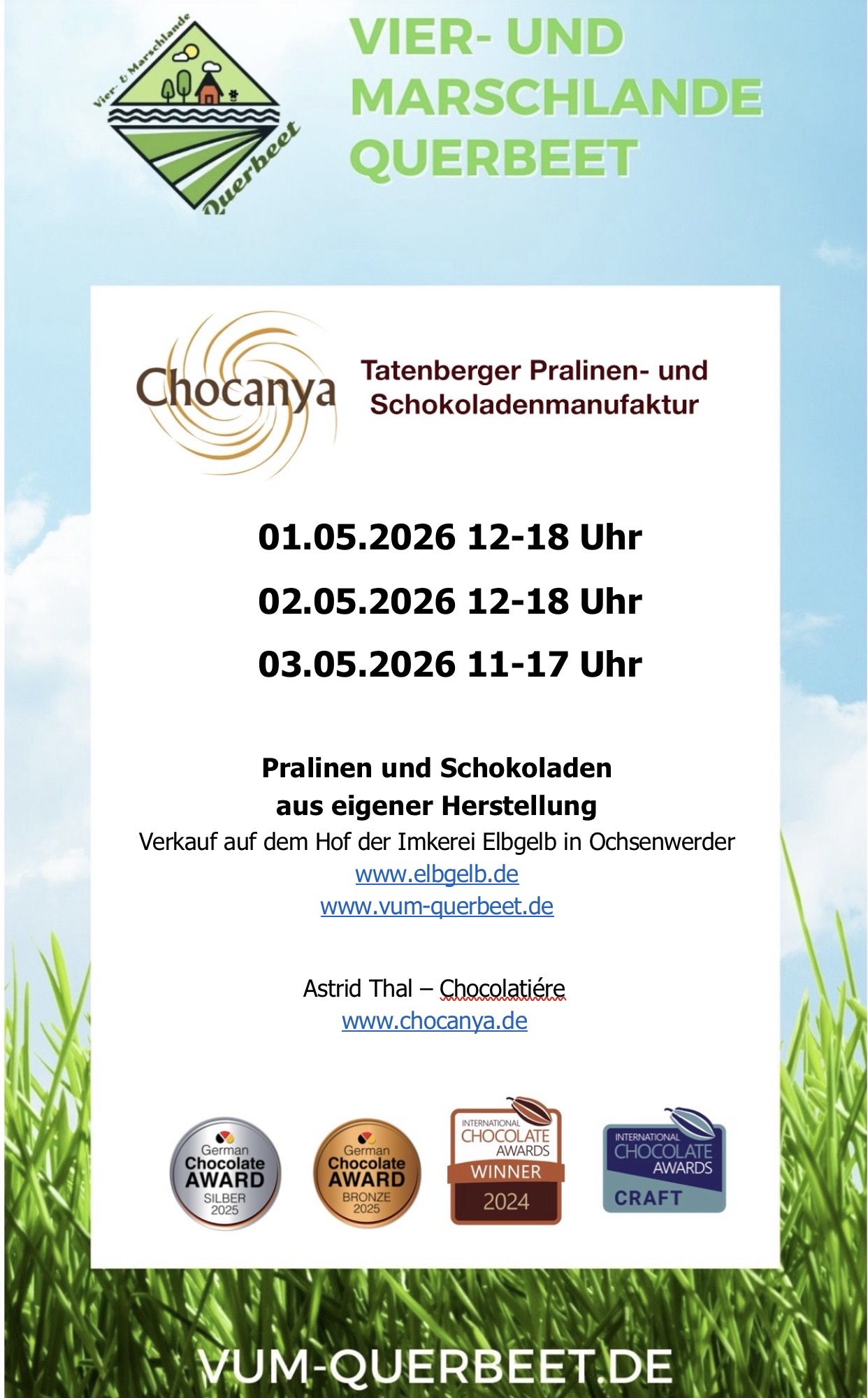 Die Pralinen- und Schokoladen-Manufaktur befindet sich in Tatenberg. Hier ist aber nur die Produktionsstätte, kein Verkauf! Der Verkauf findet auf Wochenmärkten, Kunsthandwerkermärkten und Weihnachtsmärkten statt.